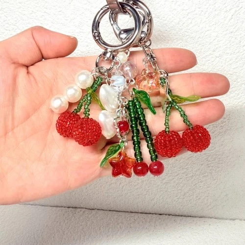 Fashionable Cherry Designs Keyring with Heart and Beads Detail Bag Pendant