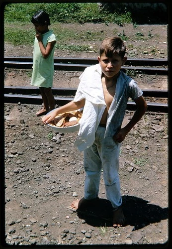 35mm Slide Costa Rica Young Vendor Railway Station Children Food Seller 1970