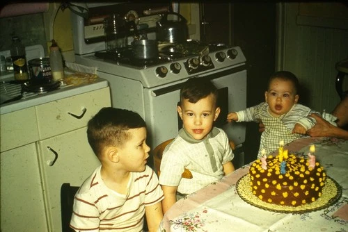 1950 Kodachrome 35mm Slide Birthday Cake Boys Kitchen Maxwell House USA Children