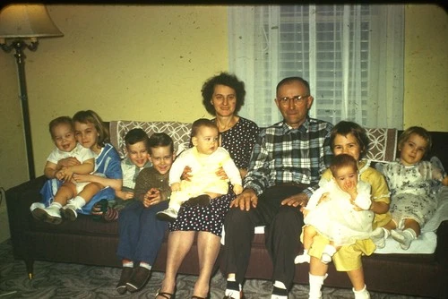 1960 Kodachrome 35mm Slide Family Portrait Sofa Children Adults Home Woman Wall