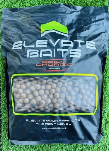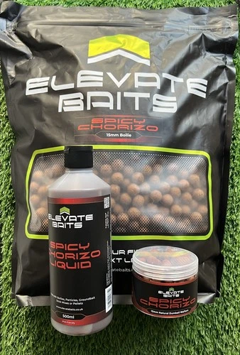 Bundle-Elevate Baits 5kg Spicy Chorizo Boilies 15mm/Liquid & dumbbell Wafters