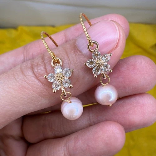 Natural Freshwater Pearl Earrings Bridal 14K Gold Plated Zircon Flower Jewelry