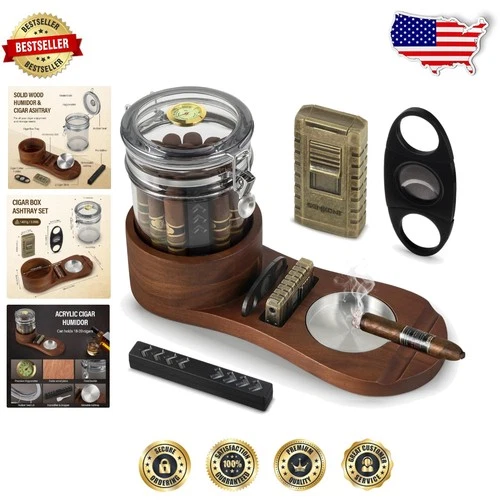 Pro Cigar Humidor Set, Solid Wood Tray, Acrylic Jar, Cutter & Lighter Included