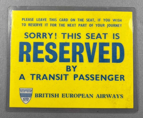 BEA BRITISH EUROPEAN AIRWAYS SEAT RESERVED TRANSIT PASSENGER AIRLINE SIGN CARD