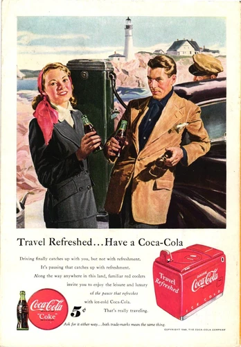 Coca Cola Classic Print Ad Tourists Road Trip Lighthouse Water Scene c1949