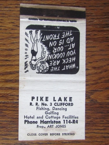 CANADIAN TAX STAMP GIRLIE MATCHCOVER: PIKE LAKE COTTAGES CLIFFORD, ONTARIO -A30