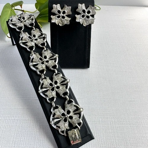 Vintage Silver Tone Bracelet and Clip On Earrings Set Floral Costume Jewelry