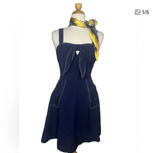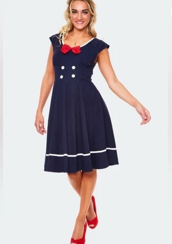 Voodoo Vixen Catalina Seaside Dress Navy Red Bow Nautical Pin-Up Size L