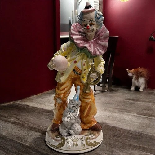 Capodimonte Clown & Dog Figurine Made in ITALY Hand Painted 21" Horn Ball HEAVY