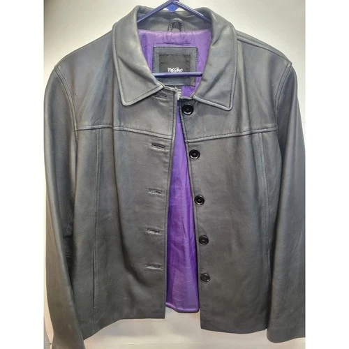 Vtg Mossimo Black Genuine Leather Jacket L Purple Lining Button Front Coat