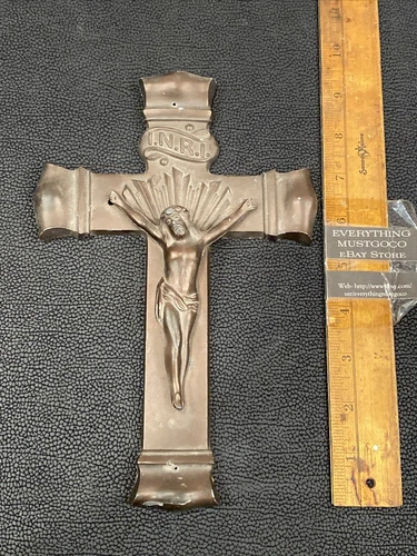 Antique Cast Metal Casket Cross Crucifix Silver INRI Coffin Wall Hanger Plaque