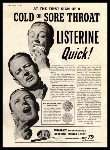 1942 Listerine Antiseptic "At The First Sign Of A Cold Or Sore Throat" Print Ad