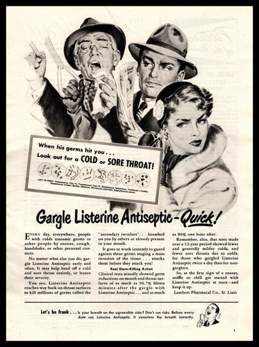 1948 Gargle Listerine Antiseptic For Germs Sniffles Sore Throat & Colds Print Ad