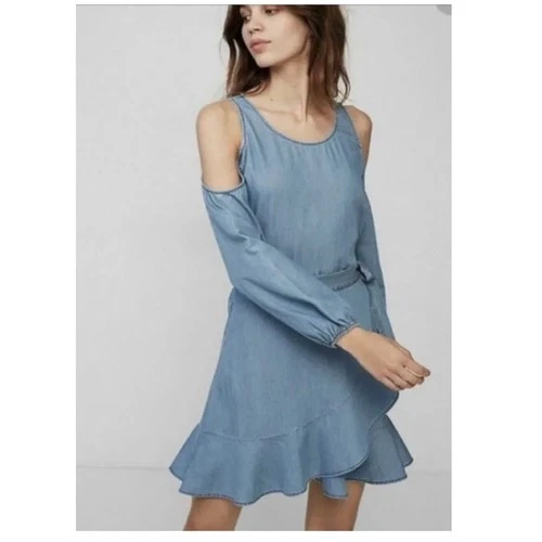 Express Chambray Cold Shoulder Wrap Mini Dress Womens Small New Blue Cotton