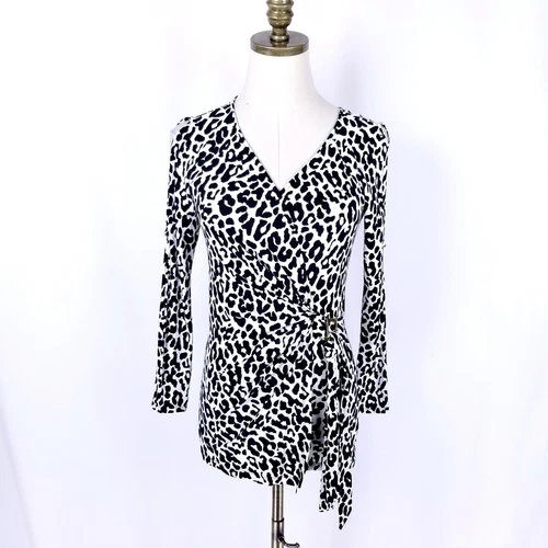 Cache Long Sleeve Cold Shoulder Faux Wrap Top Size XS Black White Animal Print