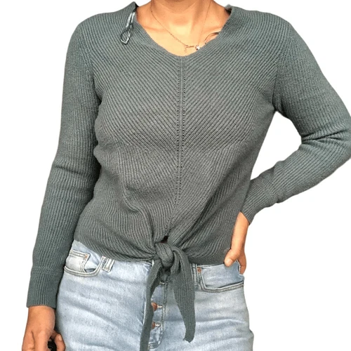 Rue & Willow Cropped Fall Knit Sweater Bow Tie Green Women Size Medium V Neck