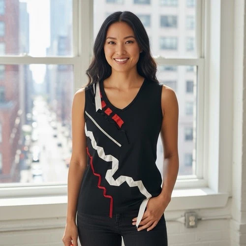 Asymmetrical V-Neck Ribbon Tank Top Womens S Black Avant-Garde Edgy Gothic Artsy