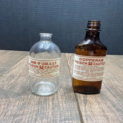 2 Vintage Antique Style Poison Drug Store Bottles with Retro Pharmacy Labels