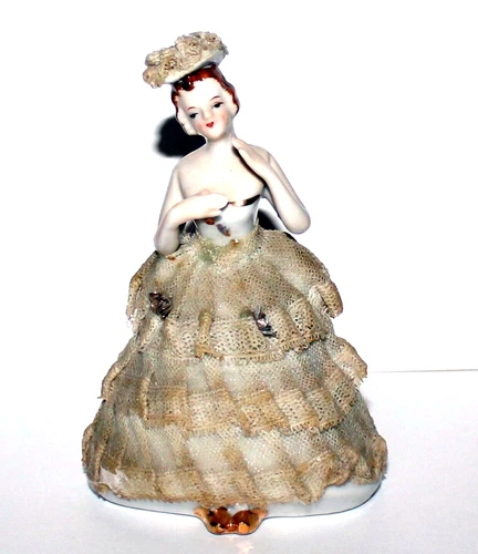 Victorian Dresden Lace Lady Flowers in her Dress Gold Shoes, Colonial OBG1