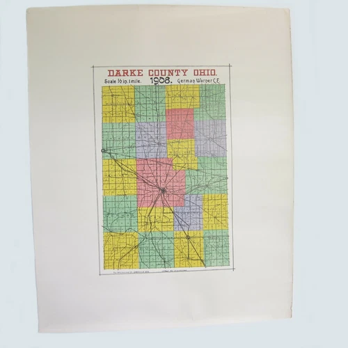 Antique 1908 Darke County Ohio Map, LARGE Railroad & Township Color Map 27x22 A