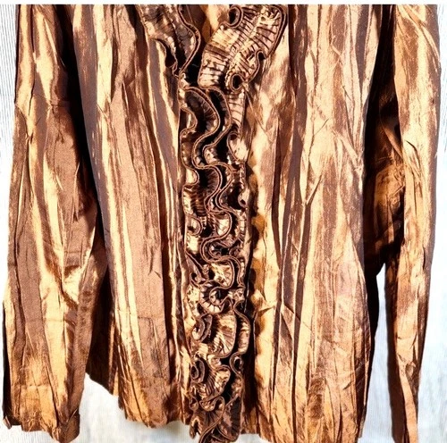 Vintage ColourWorks Ruffle Front Shirt Copper Crinkle Satin Button Up L