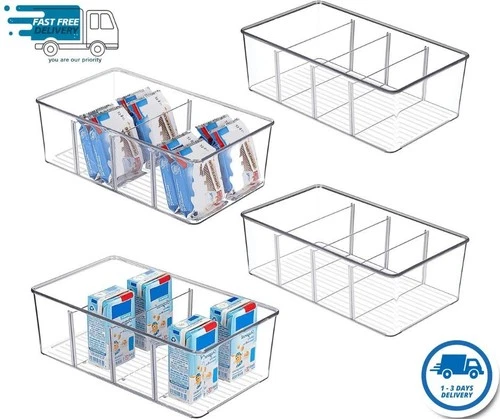 4 Pack Clear Food Storage Bins Pantry Fridge Organiser 4 Compartment Free P&P