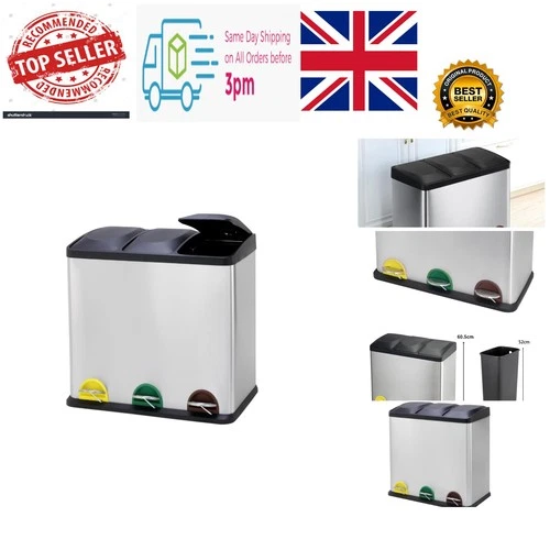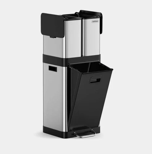 VonHaus 32L Stainless Steel Triple Recycling Bin Silver/Black, 3 Compartments