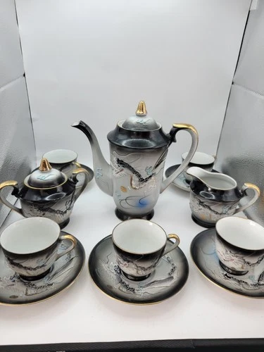 Vintage Japanese Moriage Dragonware Tea Set 15 Piece Hand Painted Geisha Cups