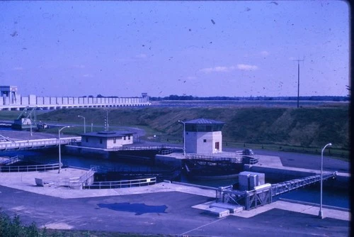 1960 Kodachrome 35mm Slide Canal Lock Control Tower Waterway USA Building Roof