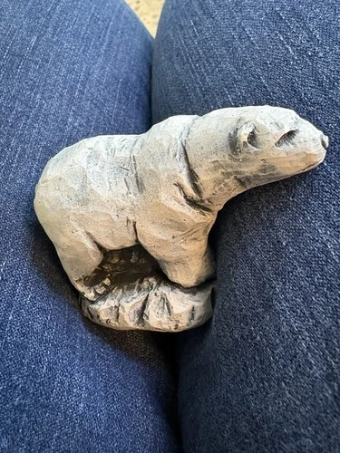 Bear sculpture, blueish gray, feels cool to touch, S mark on bottom