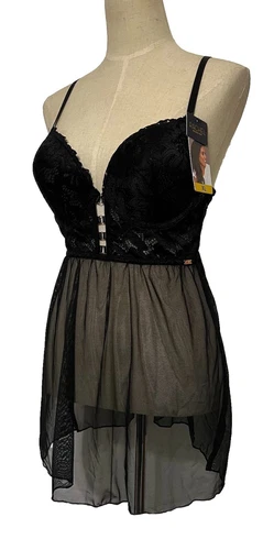 Rachel Roy XL Nightie Black Lace Mesh Padded Cups 3 Hook Bra Copper Accent Logo
