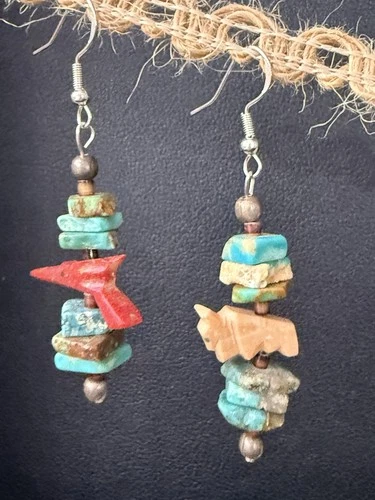CMC Handcrafted One Of A Kind Earrings Sterling Silver Turquoise Coral Fetish