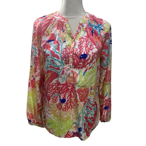 Charlie Paige S Pullover Blouse Bright Coral Floral Long Sleeve Top Shirt Womans