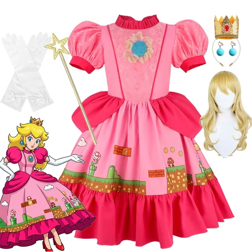 Kids Princess Peach Cosplay Dress Costume 110-150 Set Girls Fancy Dress Outfit
