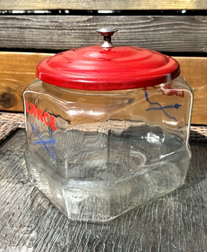 Vintage LANCE Glass Peanut Cracker Countertop Advertising Store Jar W/ Metal Lid