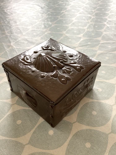 A Newlyn Arts And Crafts Copper Box Decorated With Fish And Shells