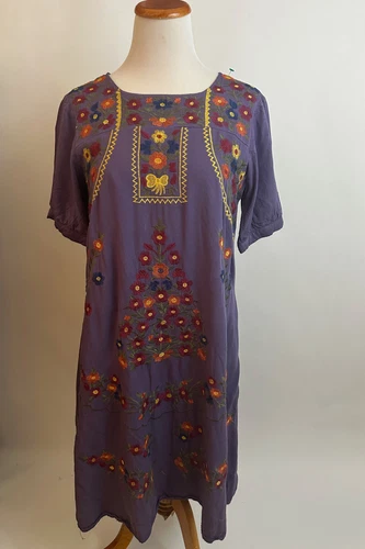 ORANGE CREEK purple rayon embroidered shift dress w/ pockets S