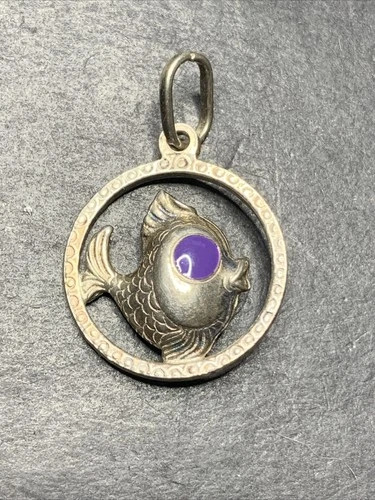 Sterling Silver 925 Lot Necklace Pendant U43 Purple Eye Enamel Fish Puffy Circle