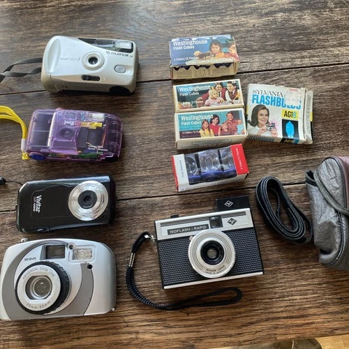 Lot of 4 Vintage Point And Shoot 35mm Cameras Agfa Fuji 1 Digital + Flash Cubes