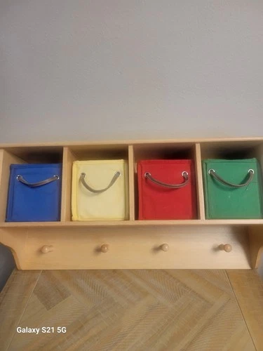 “Kids Wall Storage Cubby Shelf w/ 4 Fabric Bins & Hooks Wood Organizer Toy Stora