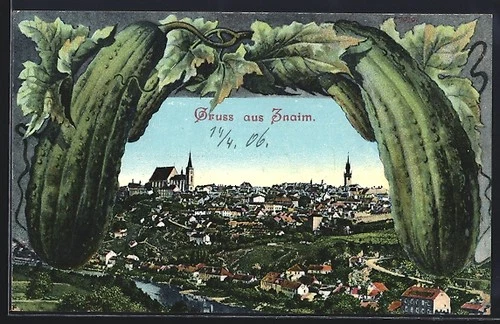 Znojmo, Town View Framed by Cucumbers, Postcard 1906