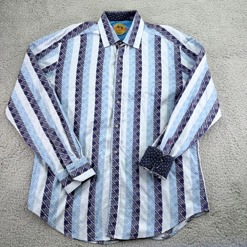 Robert Graham Shirt Mens XL Blue Flip Cuff Silk Trim Keep Smiling MISSING BUTTON