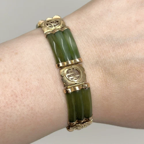 Vintage RARE ANTIQUE 18kt Gold Nephrite Jade Triple Bar Chinese Symbols Bracelet