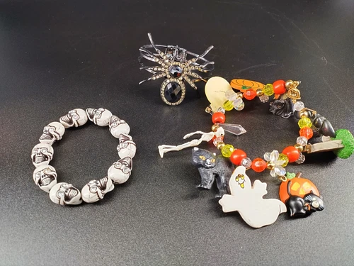 3 Halloween Bracelets Sm Spider Cuff Stretchy Skulls Bangle Jewelry Costume