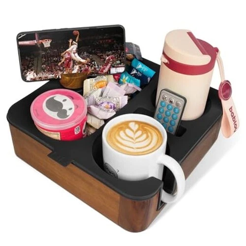Couch Cup Holder Tray, Real Acacia Wooden Caddy with Soft Silicone, Snack Black