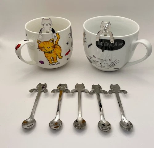 Cat Theme Bundle of 7 x Hanging Teaspoons plus 2 Cups/Mugs Rayware/Unbranded
