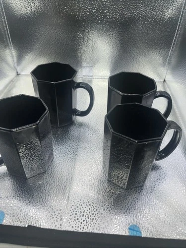 1980 Arcoroc France Black Glass Octagon OCTIME Coffee Mugs Cups Set of 4 Vintage