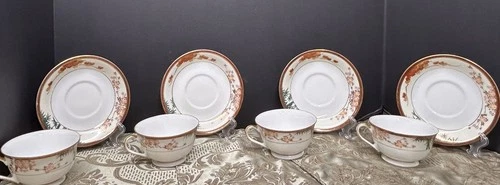 Antique Kutani Ware Tea Cup & Saucer Set Of 4Gold Detail Bamboo & Cherry Blossom
