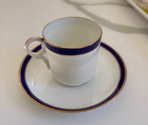 Vintage coffee cups and saucers with with cobald blue band and gild trim