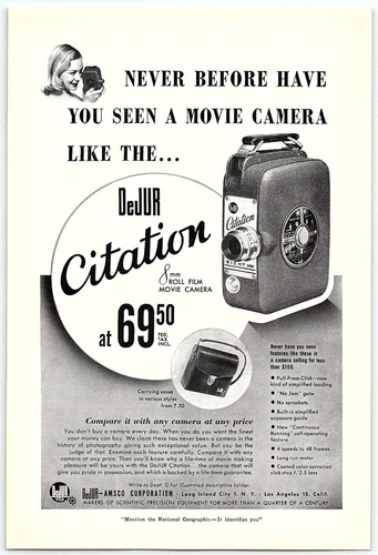1940s DeJUR CITATION 8mm ROLL FILM MOVIE CAMERA FULL PAGE PRINT AD Z4363